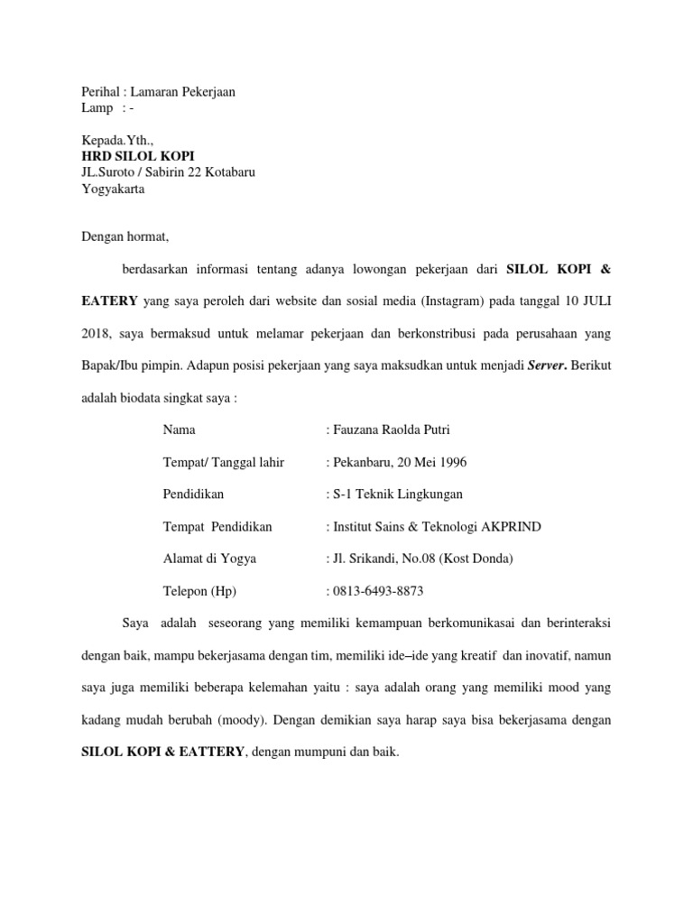 Contoh surat lamaran kerja di cafe. Gresik 12 september 2018. Setiap melamar pekerjaan. Akan tetapi pada contoh saat ini adalah contoh surat lamaran pekerjaan untuk cafe ataupun restoran. Pengalaman kerja dan skill 7. Contoh surat lamarankerjadi cafesebagai barista. Contoh surat lamaran kerja di cafe dan restoran berwisata kuliner sudah menjadi salah satu pilihan keluarga untuk berkumpul maupun mencari hiburan sejenak apalagi saat menjelang libur akhir pekan.