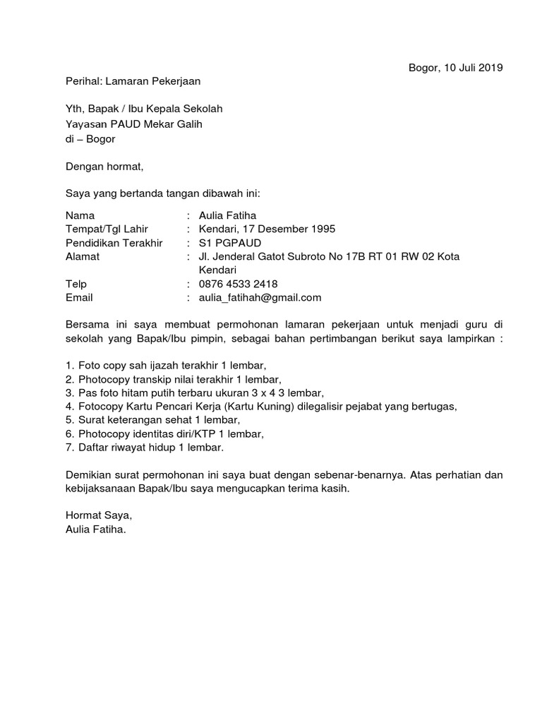 Contoh surat lamaran kerja guru tk. Ikut andil dalam mencerdaskan anak bangsa menjadikan mereka rela untuk menuntut ilmu dengan keras untuk kemudian rela menjadi pahlawan tanpa tanda jasa untuk kesejahteraan negara. Guru tkpaud memiliki karakteristik lain dengan guru lainnya mereka merupakan guru yang berdedikasi tinggi untuk mendidik anak mulai dari kecil dan membentuk karakter serta memperkuat imajinasi mereka. Contoh surat lamaran kerja untuk guru tk dibawah ini dibagi menjadi lima sesaui informasi lowongan kerja yang didapat. Namun anda tidak perlu merangkai kosakata lagi karena ada beberapa contoh surat lamaran yang dapat anda gunakan tinggal mengganti beberapa poin yang sesuai dengan latar belakang anda. Contoh surat lamaran kerja guru paud tk contoh surat lamaran kerja guru paud tk yang dapat anda gunakan dalam melamar pekerjaan sebagai guru yang profesional agar dapat segera di terima. Contoh surat lamaran kerja guru yang baik dan benar sesuai eyd saat membuat surat lamaran kerja guru pergunakan bahasa yang santun dan formal serta pilihlah kosakata yang sesuai dengan eyd.