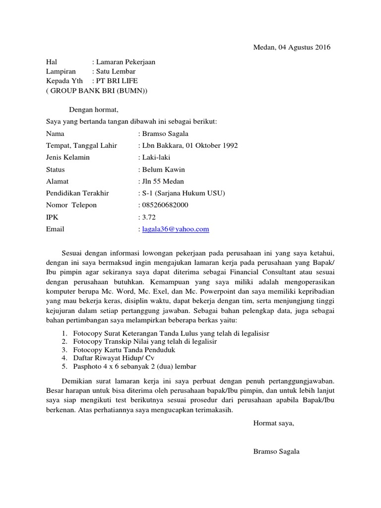 16 contoh surat lamaran kerja via email terbaru yang baik dan benar di era modern seperti saat ini contoh surat lamaran kerja via email lebih banyak dicari oleh mereka yang saat ini tengah mencari pekerjaan. Membuat surat lamaran kerja atas dasar inisiatif sendiri memang memiliki banyak peluang lebih diterima dibandingkan saat anda melamar kerja saat ada lowongan yang buka namun membuat surat lamaran kerja atas dasar inisiatif sendiri juga perlu keahliaan terutama pada saat sesi wawancara umumnya sesi wawancara kerja adalah saat di mana anda menjual diri baik itu skill atau kelebihan anda. Bahkan untuk perusahaan yang membuka lowongan online pun juga sudah tidak membutuhkan surat lamaran kerja ini. Surat lamaran kerja benar benar merupakan hal kebutuhan utama bagi kita para pencari kerja untuk mendapatkan pekerjaan yang layak apakah dari kita yang baru saja wisuda kuliah pindah kerja dari perusahaan lain mencari suasana yang baru ataupun. Dulu surat lamaran kerja memang selalu dikirimkan lewat pos atau diantar langsung ke perusahaankantor. Contoh surat lamaran kerja membuat surat lamaran kerja tidak boleh asal dalam membuatnya membutuhkan acuan sebagai referensi contoh surat lamaran kerja ini adalah salah satu bahan yang bisa dijadikan acuan dalam membuat surat lamaran pekerjaan.