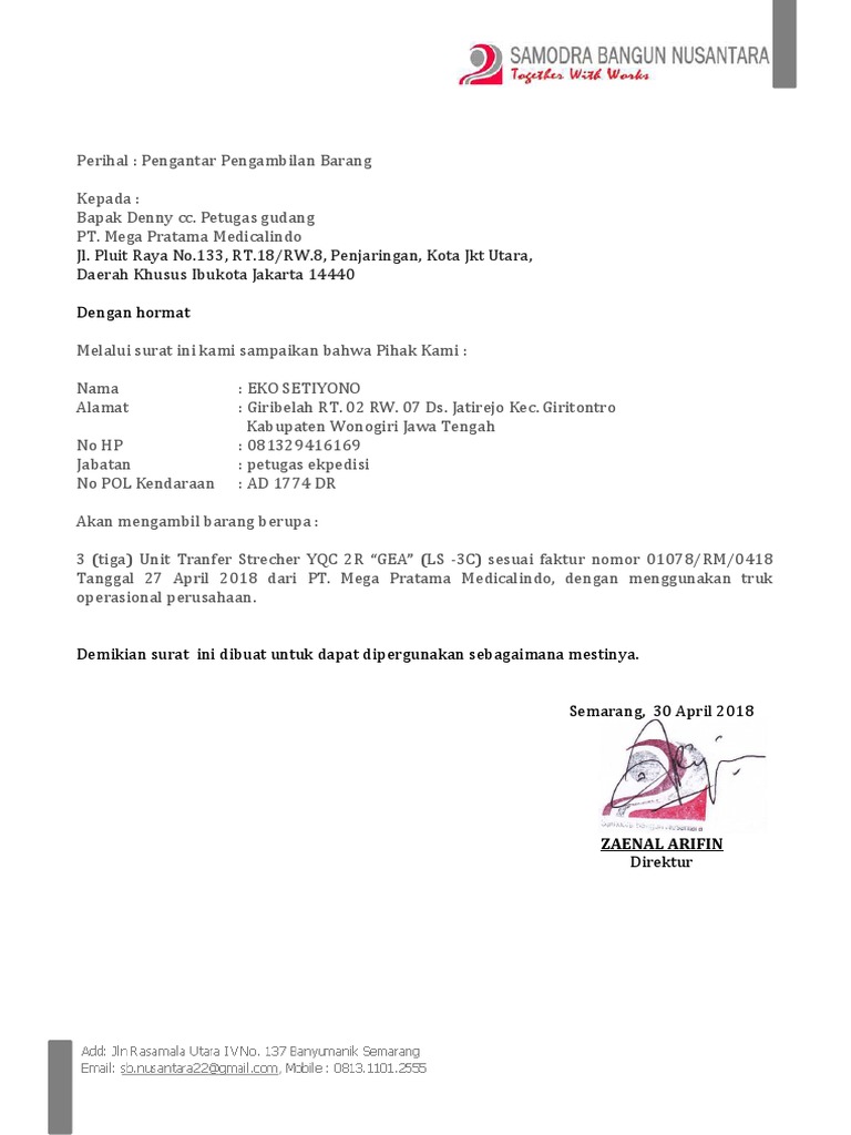 Semoga dapat memberikan manfaat. Surat jalan pengambilan barang adalah surat yang ditujukan kepada seseorang pejabat atau perusahaan yang menerangkan bahwa pihak yang telah ditunjuk memang benar merupakan perwakilan perusahaan terkait untuk mengambil barang yang diperlukan. Surat jalan sendiri tidak hanya sebagai konfirmasi melainkan akan menjadikan pegangan untuk orang gudang ketika nanti di tanyakan oleh pihak keuangan. Surat pengantar pengambilan barang merupakan salah satu contoh surat resmi. Contoh surat pengantar pengambilan barang dengan format resmi yang baik sebagai referensi dalam membuat contoh surat pengantar yang benar. Preview contoh surat permohonan izin keluarmasuk barang.