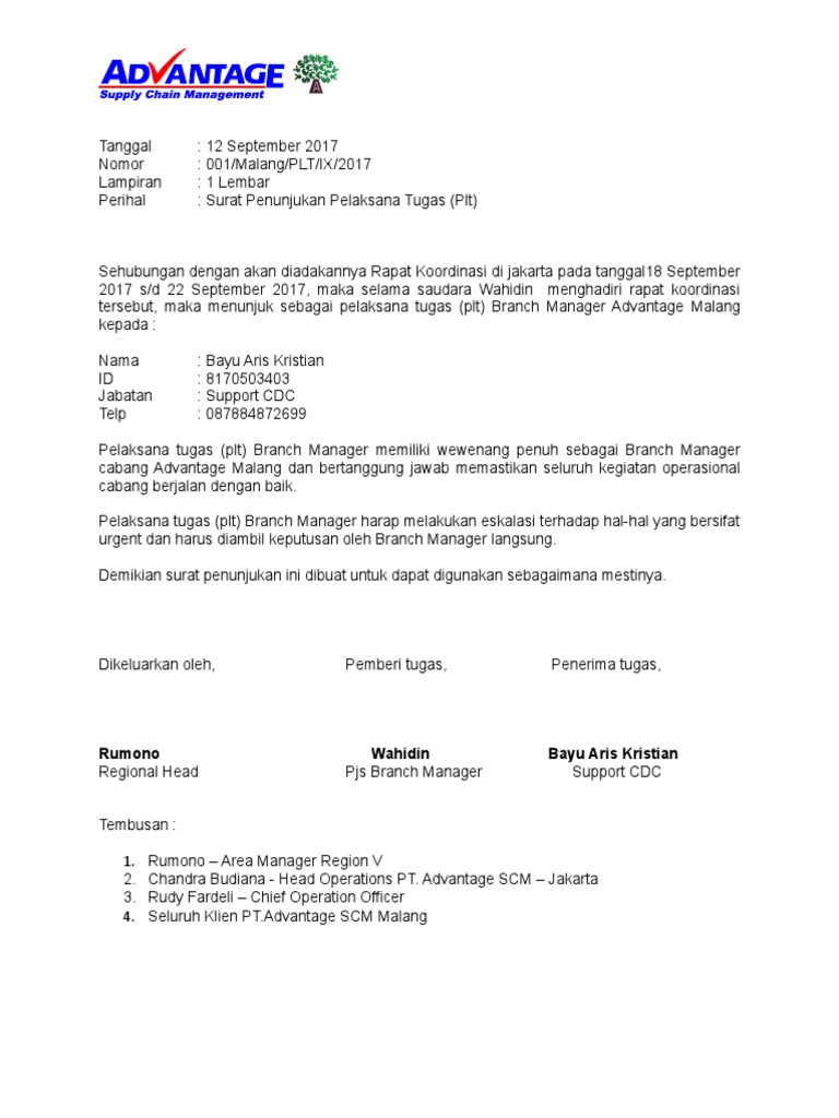 Contoh surat penunjukan pelaksana tugas. Contoh surat penunjukan pelaksana tugas. Contoh surat penunjukan plt. Karena menjalankan mandat menurut surat edaran badan kepegawaian negara nomor 2sevii2019 tahun 2019 tentang kewenangan pelaksana harian dan pelaksana tugas dalam aspek kepegawaian se bkn 22019 plh atau plt tidak berwenang mengambil keputusan danatau tindakan yang bersifat strategis yang berdampak pada perubahan status hukum pada aspek organisasi kepegawaian dan alokasi anggaran. Contoh surat penunjukan tugas sementara. Contoh surat penunjukan ini memuat tugas dan hak atas pencetakan suatu buku. Kumpulan contoh surat surat lamaran pekerjaan dinas resmi surat kuasa permohonan niaga undangan hukum surat cintasurat ijin surat keputusan contoh surat.