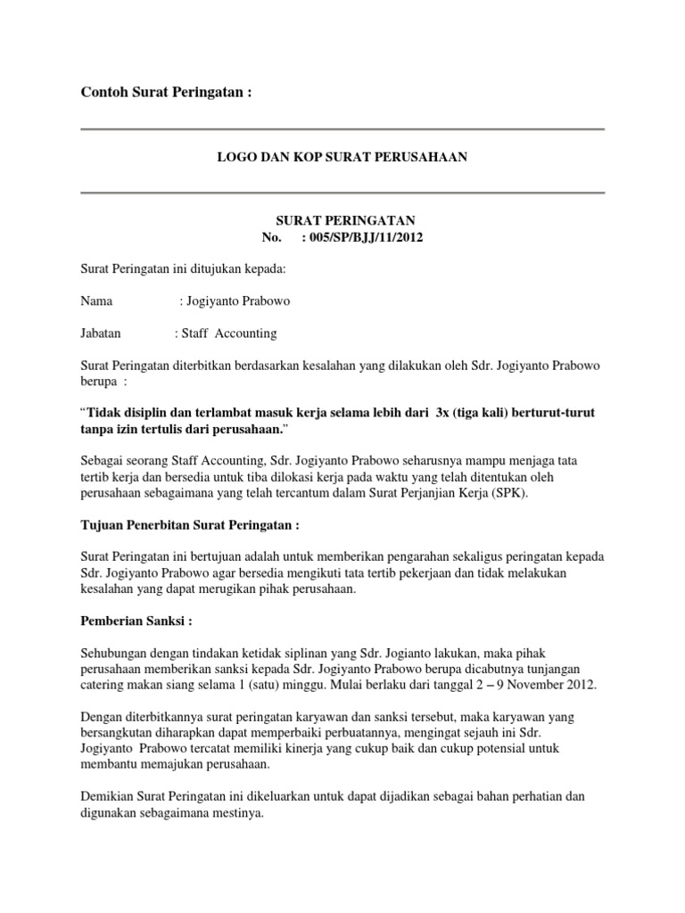 Untuk mendapatkan file contoh surat peringatan kerja sp 1 2 3 untuk karyawan tidak disiplin yang tidak diproteksi dan bebas untuk diedit silahkan anda kunjungi situs kami. Contoh surat panggilan peringatan karyawan sebagai seorang karyawan swasta yang mendapatkan gaji dari perusahaan maka tentu anda akan memiliki tanggung jawab terhadap perusahaan tersebut. Tingkat paling rendah adalah sp1 dan jika sudah mencapai sp3 maka bisa dikatakan ada terancam untuk dikeluarkan dari tempat kerja. Untuk anda sebagai karyawan perusahan jangan sampai mendapatkan surat peringatan dan bekerjalah dengan baik semoga mendapatkan bonus. 4 contoh surat peringatan karyawan beserta kasusnya karyaone 17 contoh surat rekomendasi baik benar dan yang disarankan. Surat peringatan biasanya dikeluarkan oleh hrd atau personalia.