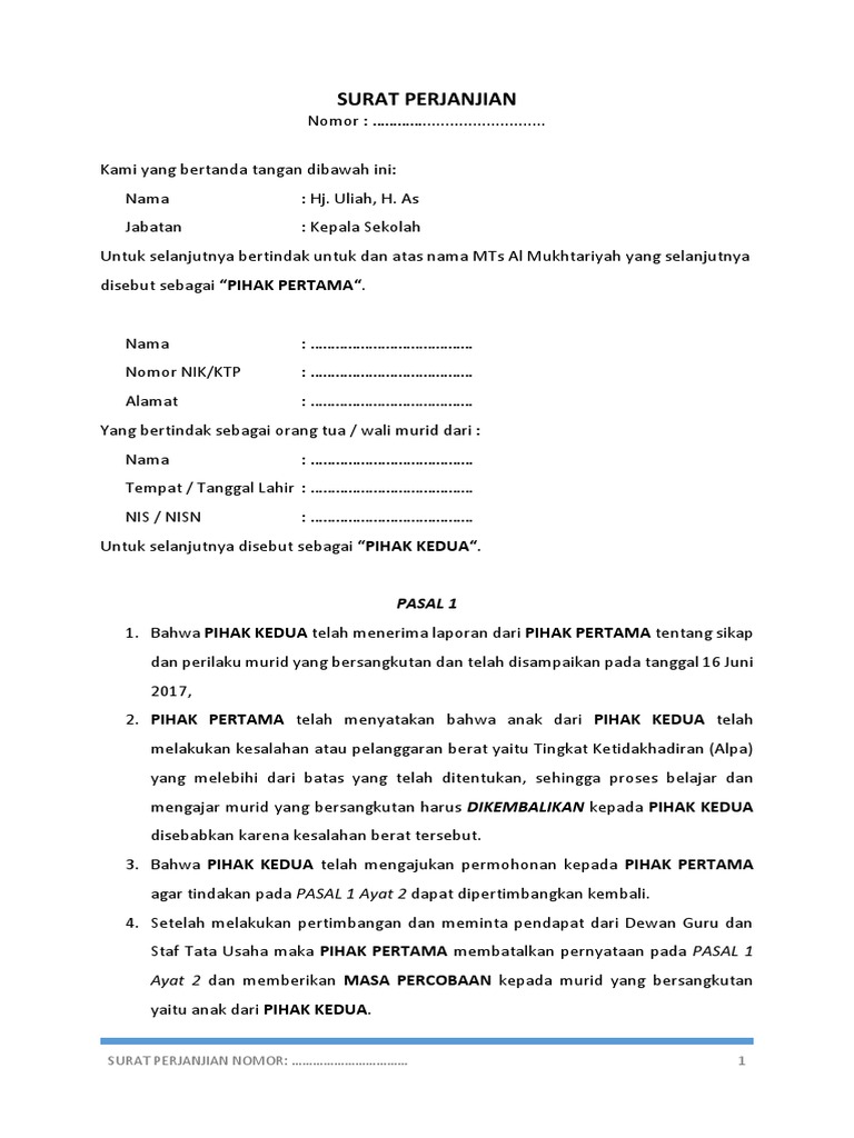 Contoh surat perjanjian siswa bermasalah. Contoh surat perjanjian siswa jasa pembuatan administrasi bpbk di sekolah dan ptkbk hubungi kami di 081222940294 untuk detail harga. Contoh surat pemberhentianpemecatan siswa. Surat pernyataan siswa bermasalah biasanya dibuat oleh siswa atau siswi di sekolah baik sd smp smk yang melakukan pelanggaran terhadap tata tertib atau peraturan yang telah dibuat oleh sekolah. Surat pernyataan biasanya dibuat oleh orang yang ingin menerangkan sesuatu agar bisa dipercaya oleh penerima surat. Surat yang berisi kesepakatan inilah yang kemudian diberi nama surat perjanjian. Surat perjanjian ini meliputi banyak hal dan bidang dan juga sering dipergunakan oleh banyak pihak.