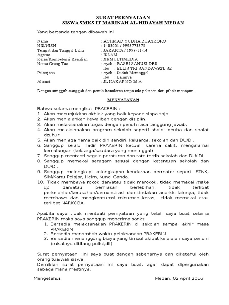Contoh surat pernyataan siswa nakal tidak akan mengulangi perbuatannya berikut ini adalah contoh tentang contoh surat pernyataan siswa nakal tidak akan mengulangi perbuatannya seperti contoh surat yang ditulis di bawah ini. Surat pernyataan siswa bermasalah biasanya berisi permohonan maaf dari siswa perjanjian siswa dengan sekolah untuk tidak mengulangi kesalahan yang telah di perbuat.