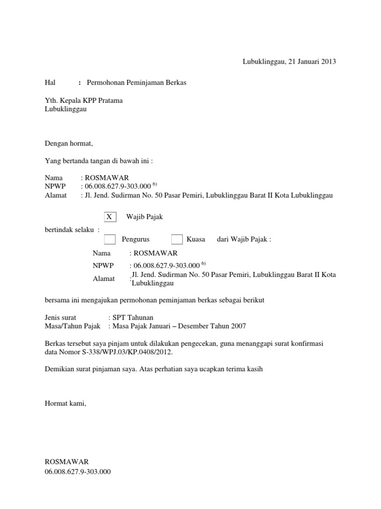 Contoh surat permintaan data ke kantor pajak. Surat permohonan perubahan data ini cukup penting karena seiring dengan berjalannya waktu kita biasanya akan melakukan perubahan data misalnya kita melakukan pindah alamat maka kita harus melakukan perubahan data alamat yang akan sangat penting untuk data pada perusahaan dimana kita bekerja ataupun pada bank dimana kita memiliki tabungan didalamnya. Surat balasan pajak tanggapan surat permintaan penjelasan atas data. Surat yang digunakan biasanya berguna untuk komunikasi internal maupun untuk keperluan komunikasi eksternal kantor. Pada kesempatan kali ini admin akan memberikan paparan tentang contoh surat permohonan dimulai dari pengertian fungsi dan tujuan jenis jenisnya ciri cirinya hal hal apa saja yang harus diperhatikan. Dasar hukum yang mengatur tentang surat himbauan adalah se 39pj2015 tentang pengawasan wajib pajak dalam bentuk permintaan penjelasan atas data danatau kunjungan visit kepada wajib pajak. Jika data e faktur hilang atau rusak maka pkp bisa mengajukan permintaan data e faktur ke djp melalui kantor pelayanan pajak kpp tempat pkp terdaftar dengan menyampaikan surat permintaan data e faktur sebagaimana diatur pada lampiran yang merupakan bagian yang tidak terpisahkan dari peraturan ini.