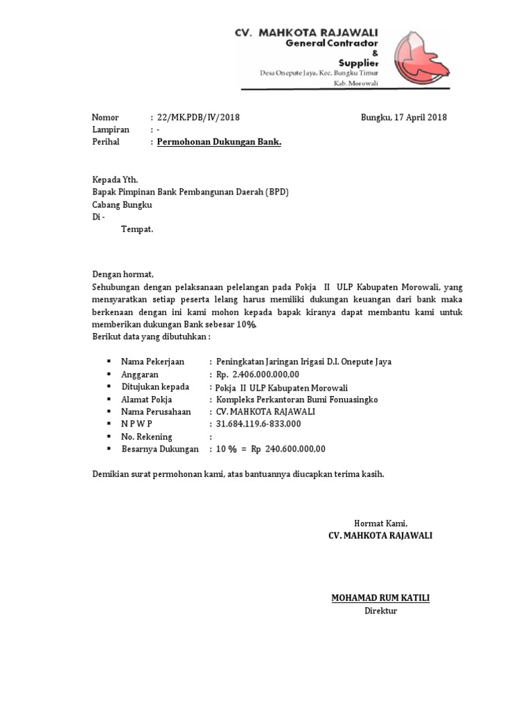 Simpan simpan surat permohonan dukungan bank untuk nanti. Contoh surat permohonan magang. Surat permohonan dukungan bank dalam pengadaan merupakan surat yang dikeluarkan oleh ptcv perusahaan yang ingin mengikuti pengadaan barangjasa supaya pihak bank mengeluarkan surat dukungan bank yang ditujukan ke panitia pengadaan. Permohonan dukungan bank bapak pimpinan bank jambi. Itulah beberapa contoh surat permohonan untuk berbagai kepentingan yang dapat kamu jadikan rujukan dalam membuat surat permohonan. Surat permohonan berisi tentang sebuah permintaan tentang sesuatu hal kepada pihak yang bersangkutan perseorangan badan atau lembaga organisasi perusahaan atau instansi dan lainnya.
