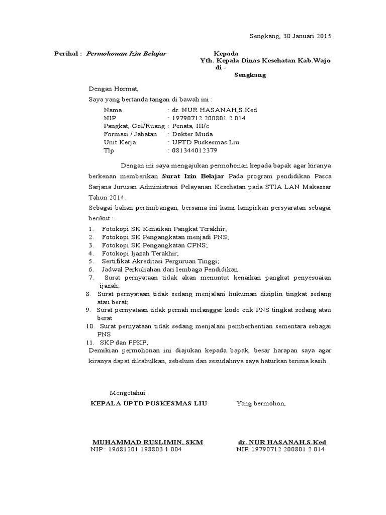 19690619 199403 1 006 tanggal 23 agustus 2012 dimana tembusannya sudah disampaikan kepada kepala dinas kesehatan kabupaten jember maka dengan ini saya sampaikan kepada kepala dinas kesehatan kab. Contoh surat permohonan izin belajar guru melanjutkan kuliah magister s2 pendidikan berikut ini adalah contoh tentang contoh surat permohonan izin belajar guru melanjutkan kuliah magister s2 pendidikan seperti surat contoh yang tertulis di bawah ini.