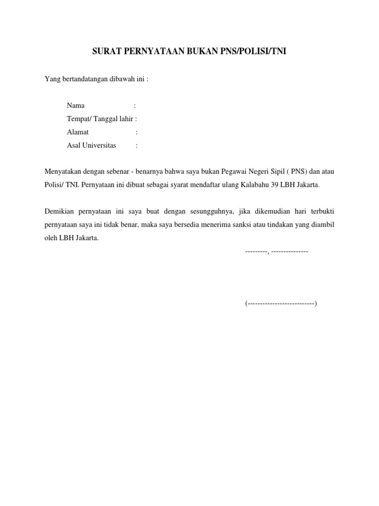 Selain dalam hal transaksi surat pernyataan juga diperlukan dalam masalah pekerjaan salah satunya adalah pengajuan cpns. Surat ini dipergunakan untuk menegur ataupun memperingkatkan seorang karyawan ataupun pegawai yang berbuat kesalahan. Apabila dikemudian hari bahwa pernyataan yang saya buat tidak benar maka saya bersedia menerima sanksi hukum sesuai dengan peraturan yang berlaku. Contoh surat pernyataan sedang tidak menerima beasiswa dari pihak manapun untuk pengajuan beasiswa kuliah. Contoh surat pernyataan adalah pembahasan kita kali ini. Bukan pegawai negeri sipil tni polri.