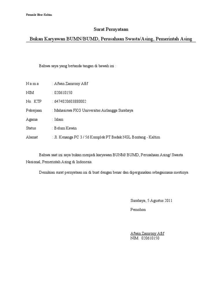 Surat tersebut digunakan untuk keperluan kantor dan komunikasi eksternal maupun untuk keperluan pribadi yakni antara anda dengan pihak perusahaan. Contoh surat pengunduran diri berikut ini 3 contoh surat untuk pengunduran diri karyawan perusahaan dalam format sederhana tapi bisa digunakan secara resmi. Contoh surat pernyataan pernyataan bisa dilakukan secara lisan maupun non lisan atau tertulis. Ditujukan buat rekan rekan yang mebutuhkan rujukan dalam membuat surat pernyataan maupun surat pernyataan kesanggupan dengan format yang baik dan benar. 15 contoh surat pernyataan diri yang baik dan benar seiring dengan perkembangan zaman dan kecanggihan teknologi sekarang ini penggunaan surat sebagai alat komunikasi juga semakin menurun. Hallo sobat sharing pada kesempatan ini saya akan menyajikan banyak contoh surat pernyataan kerja kesanggupan sikap belum menikah dll beserta format dan cara penyusunannyakamu pasti sedang membutuhkannya.