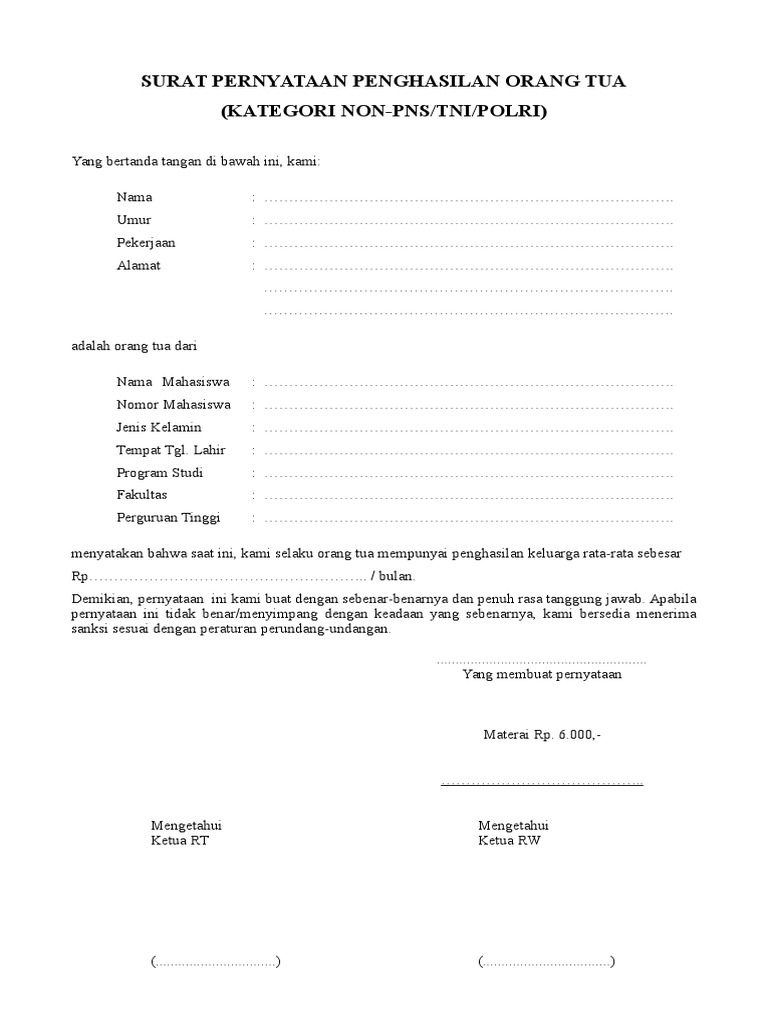 Contoh surat pernyataan penghasilan orang tua ini biasanya digunakan oleh pelajarmahasiswa untuk mengajukan beasiswa. Namun surat ini hanya digunakandibutuhkan jika orang tua pelajarmahasiswa tersebut tidak memiliki slip gaji. Yogyakarta 3 mei 2017. Contoh surat pernyataan penghasilan orang tua jika pada artikel sebelumnya telah kita bahas secara panjang dan lebar mengenai contoh surat keterangan tidak mampu dari ketua rt sebagai salah satu syarat ketika ingin mengajukan beasiswa atau bantuan dana dari pemerintah maka kali ini kita akan membahas mengenai salah satu syarat lain yang masih ada hubungannya dengan materi tersebut. Contoh surat pernyataan orang tua setiap anak tentu akan menjadi tanggung jawab orang tua. Misalnya saja dalam melamar pekerjaan sekolah kuliah dan lain sebagainya.