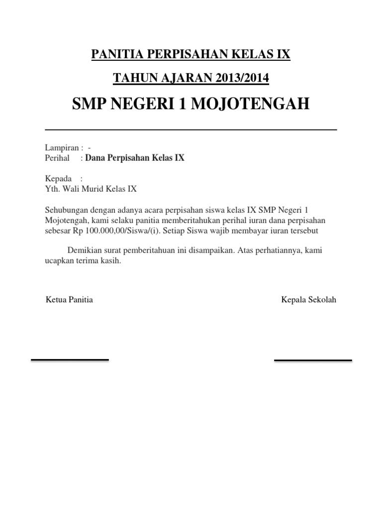Contoh surat perpisahan sekolah. Namun ketika waktu itu tiba berat rasanya kata untuk berkata iya. Contoh surat dinas resmi sekolah setiap kegiatan sekolah yang bersifat resmi biasanya disertai dengan dikeluarkannya surat resmi. Contoh proposal kegiatan sekolah perpisahan siswa siswi kelas xii bagi kita yang aktif dalam keorganisasian di sekolah tentu akan sering mengadakan kegiatan sekolah. Surat berikut ini adalah contoh contoh surat pemberitahuan yang dapat di. Secara umum surat undangan perpisahan berfungsi sebagai. Misalnya surat resmi dari kepala sekolah surat resmi dari dinas pendidikan surat resmi osis surat undangan resmi untuk orang tua siswa.