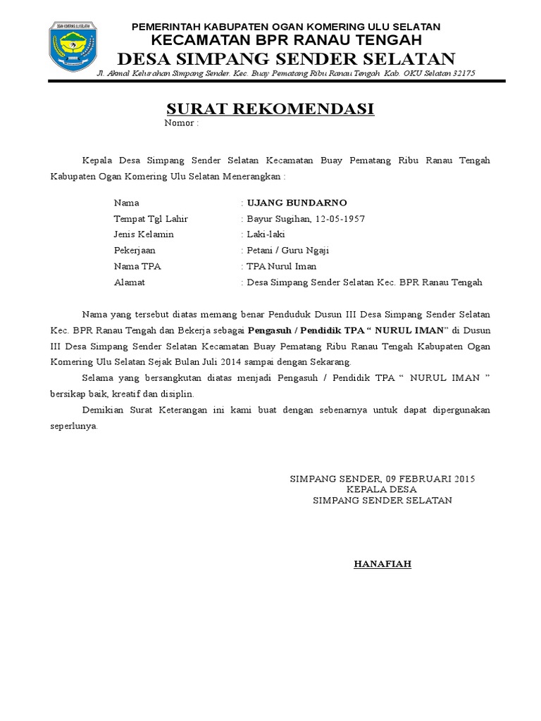 Contoh surat permohonan rekomendasi surat rekomendasi memiliki manfaat yang bagus untuk banyak orang atau pihak. Pada umumnya kita bisa mendapatkan surat rekomendasi dari pihak lain ataupun dari pejabat yang berwenang di bidang tertentu. Saat berkomunikasi dalam keseharian kita saling memberikan informasi antara satu dengan. 15 contoh surat permohonan rekomendasi paling lengkap ada banyak contoh surat yang masih dipergunakan sekarang ini baik itu untuk kepentingan pribadi maupun untuk kepentingan kelompok. Jika anda dikenal sebagai orang yang rajin bekerja dan memiliki kelakuan yang baik setiap harinya maka tentu kepala desa juga tidak akan susah untuk memberikan surat rekomendasi kerja kepada anda. Atas dasar rekomendasi inilah sehingga kepala desa menetapkan sk surat keputusan tentang pemberhentian dan pengangkatan perangkat desa.