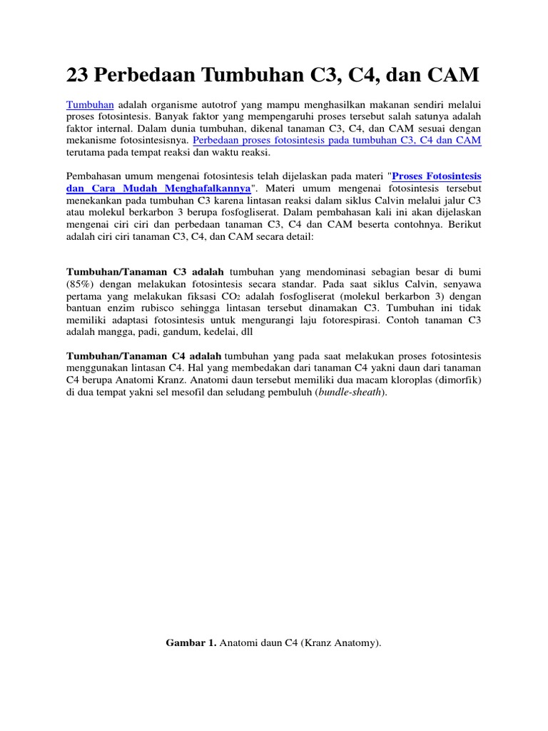 Coba ingat kembali langkah awal reaksi gelap siklus calvin benson. Tumbuhantanaman c3 adalah tumbuhan yang mendominasi sebagian besar di bumi 85 dengan melakukan fotosintesis secara standar. Tanaman c3 lebih adaptif pada kondisi kandungan co 2 atmosfer tinggi. Dibandingkan c3 tanaman c4 dan cam bersifat lebih adaptif pada daerah yang kering dan panas. Tumbuhan cam adalah tumbuhan yang dapat berubah seperti tumbuhan c3 pada saat pagi hari suhu rendah dan dapat berubah seperti tumbuhan c4 pada siang hari dan malam hari gardner 1991. Contoh tanaman c3 c4 dan cam tanaman yang termasuk c3 c4 dan cam.