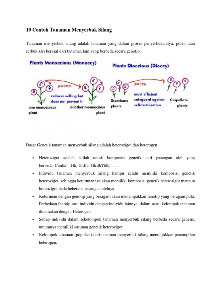 Contoh tanaman penyerbukan silang. Adapun beberapa contoh tumbuhan yang menyerbuk dengan bantuan angin ternyata banyak sekali jenisnya. Penyerbukan silang menghasilkan kombinasi satuan keturunan yang lebih beragam dari keduanya. Alel mengarah ke homosigositas sehingga susunan genetik dalam tanaman semua sebagian besar homosigot.