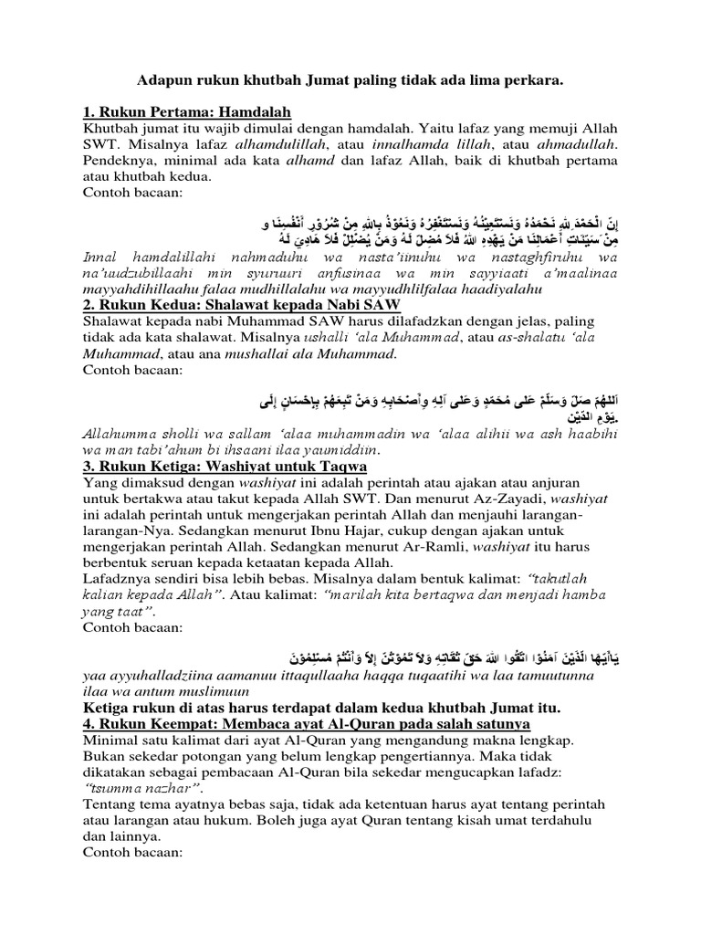 Salam sejahtera untuk kita semua. Kelima rukun tersebut disyaratkan dengan menggunakan bahasa arab harus dilakukan dengan tertib serta harus beraturan dan juga berkesinambungan atau nama lainnya yaitu muawalah. Khutbah jumat merupakan bagian elementer dari pelaksanaan shalat jumat mengapa demikian sebab dikatakan bahwa. Mereka tidak menunaikannya sesuai dengan sunnah rosulullah tidak menyempurnakan syarat syarat dan rukun rukunnya serta kewajiban kewajibannya.