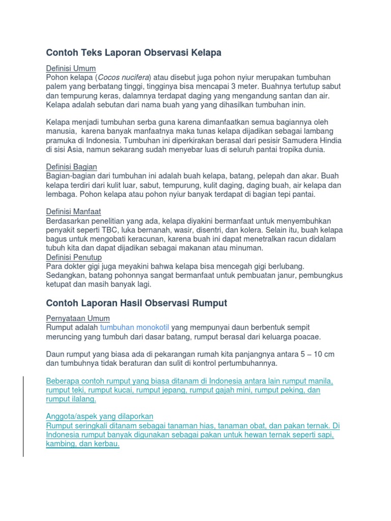Pantai dapat membatasi laut dan daratan hingga ke dalam 200 m. Contoh teks laporan hasil observasi hewan artikel ini secara khusus hanya akan membahas contoh contoh mengenai teks hasil observasi dimana sebelumnya juga pernah kita bahas mengenai pengertian struktur teks laporan hasil observasi tujuan fungsi ciri ciri dan lainnya. Berikut contoh teks laporan hasil observasi tumbuhan hewan dan lingkungan. Secara singkat adalah teks yang menjabarkan. Mengandung keterangan umum mengenai subjek yang dilaporkan. Contoh teks laporan hasil observasi buah buahan beserta strukturnya pelajaran hari ini untuk melanjutkan materi sebelumnya mengenai pengertian jenis struktur ciri teks laporan hasil observasi.