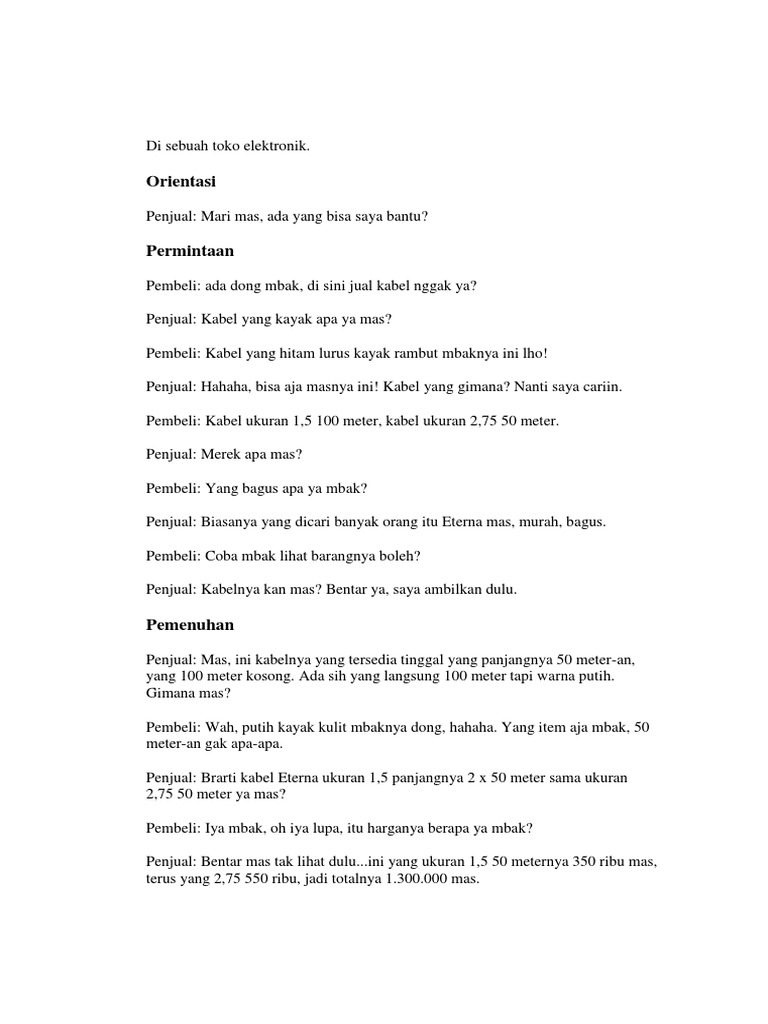 Contoh teks negosiasi jual beli sepatu. Kok mahal sekali bu.