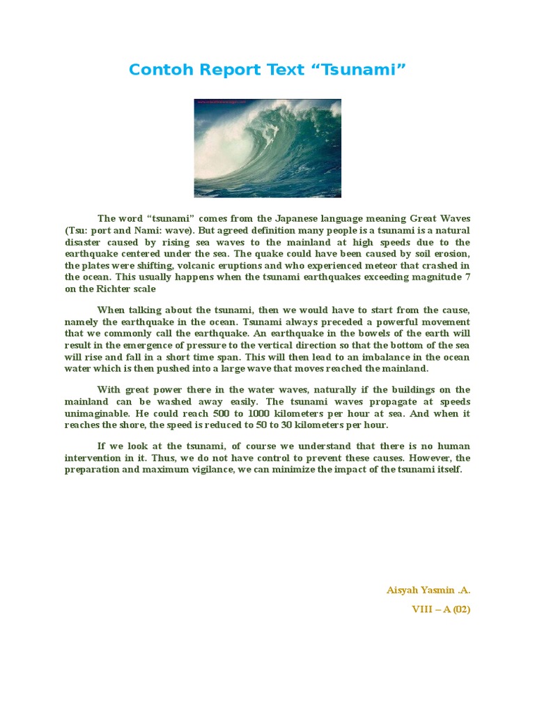 Adapan agreed definition many people is a tsunami is a natural disaster caused by rising sea waves to the mainland at high speeds due to the earthquake centered under the sea. Jakarta is located on the northwest java. Namun tahukah anda bagaimana tanah longsor dapat terjadi. Contoh report text tentang tempat. Contoh explanation text tentang tanah longsor bencana tanah longsor sering terjadi di beberapa wilayah di indonesia khususnya di daerah pegunungan. Berikut disajikan 7 contoh report text pendek bahasa inggris lenkap dengan artinya.