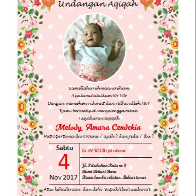Sebenarnya contoh undangan aqiqah ini mimin buat berdasarkan inspirasi dari undangan orang yang mimin terima. Jenis kartu undangan aqiqah pada umumnya undangan berbentuk kartu atau surat yang berbentuk fisik namun ternyata setidaknya ada dua jenis kartu undangan yang pertama berbentuk fisik berikutnya kartu undangan digital. Setelah memastikan semua informasi yang akan masuk dalam desain contoh undangan aqiqah selanjutnya kamu bisa membuat konsepnya. Aqiqah disunahkan untuk memotong dua ekor kambing yang seimbang untuk anak laki laki dan satu ekor untuk anak perempuan. Hehhe sayang kan kalo ada versi lain tapi ga di share.