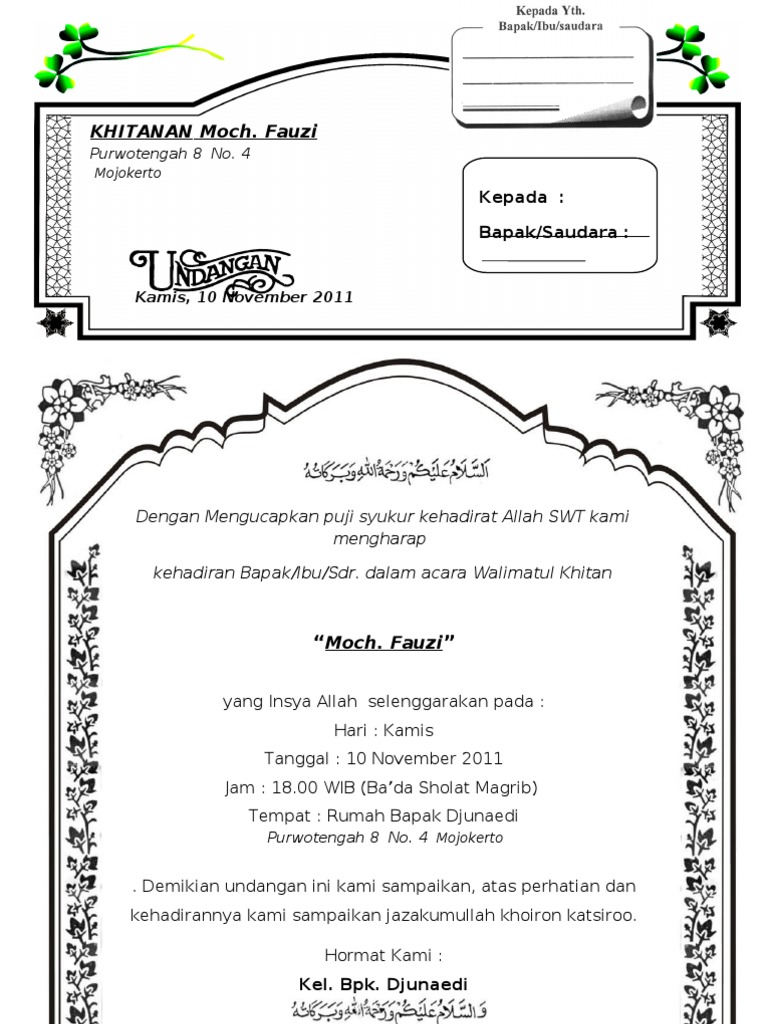 Dalam perayaan acara khitanan untuk anak kita perlu di ketahui beberapa hal hal. Hari ini team gelas pecah iseng membuat format undangan khitanan terbaru yang juga bisa digunakan untuk undangan walimatul khitan ms word doc psd cdr. Model undangan 40 hariidoc 29. والسلام عليكم ورحمة الله وبركاته hormat kami nama keluarga contoh 2. Format undangan khitanan yang bisa di edit ini bisa langsung dibuka di microsoft word selain itu contoh undangan khitanan anak contoh undangan walimatul khitan dan contoh undangan tasyakuran khitanan bisa kamu download gratis kok. Model undangan bayi kdoc 31.