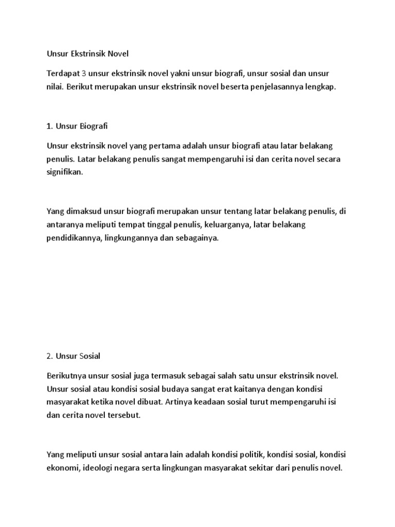 Berikut ini ada contoh dari unsur unsur ekstrinsik dibawah ini. Unsur intrinsik novel merupakan unsur utama yang membangun novel dari dalam. Jadi unsur ekstrinsik ini tidak dapat kita temukan di dalam novel tersebut. Unsur ekstrinsik novel ini meski tidak ada di dalam novel namun sangat berpengaruh terhadap hasil sebuah karya sastra.