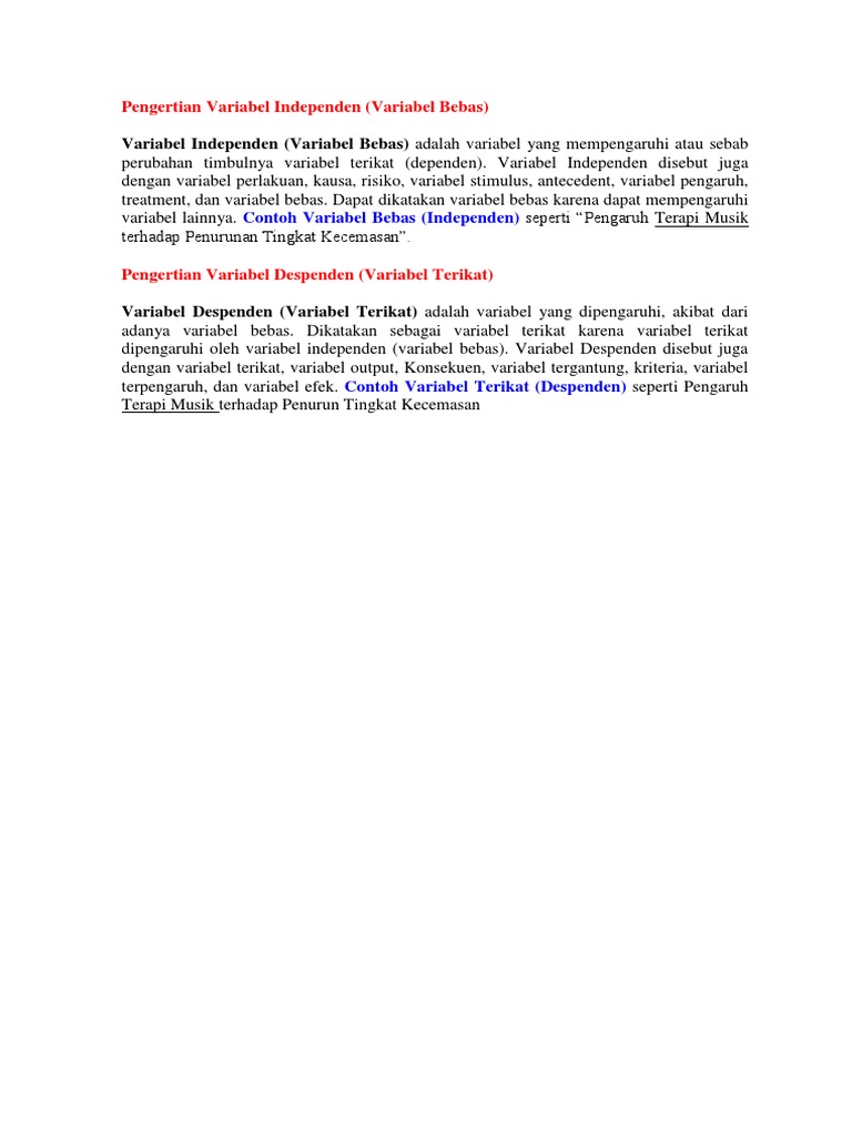 Jenis variabel penelitian yang sering disebutkan ada dua yaitu variabel bebas independen dan variabel terikat dependen. Contoh variabel dependen dan independen 2 sebelum masuk kedalam materi inti tentang apa saja contoh dari variabel dependen dan independen ada baiknya kita mulai dari memahami terlebih dahulu apa pengertian dari kedua jenis variabel dalam penelitian tersebut. Variabel independen merupakan sebuah variabel yang terjadi disebabkan karna perubahan dan juga menimbulkan variabel terikat atau juga variabel dependen. Variabel dependen adalah suatu variabel yang. 38 menjelaskan bahwa variabel adalah segala sesuatu yang berbentuk apa saja yang ditetapkan oleh peneliti untuk dipelajari sehingga diperoleh informasi tentang hal tersebut. Perlu kami tambahkan bahwa pada penelitian lain variabel dependen ataupun variabel independen bisa saja lebih dari satu 1.