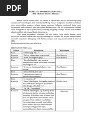 Contoh verbatim konseling individual ret rational emotif therapy. Sebelum mendownload verbatim konseling behavioral alangkah baiknya bila kita pahami kembali poin penting dari pendekatan ini. Contoh verbatim konseling individu dengan menggunakan pendekatan trait and factor. Nah itu namanya konseling vitojadi saya jelaskan sedikit ya mengenai konseling itu apakonseling ini bertujuan untuk membantu konseli memecahkan masalahnya dan pilihan terakhir ditangan konseli itu sendiri dan azas yang digunakan antara lain pertama azas kerahasiaan dimana permasalahan anda hanya kita berdua yang mengetahuinya yang kedua azas keterbukaan dimana konseli atau anda. Biodata klien nama. Konseling itu dilandasi oleh asas asas seperti kerahasiaan kesukarelaan keahlian kegiatan kemandirian dan masih banyak yang lain.