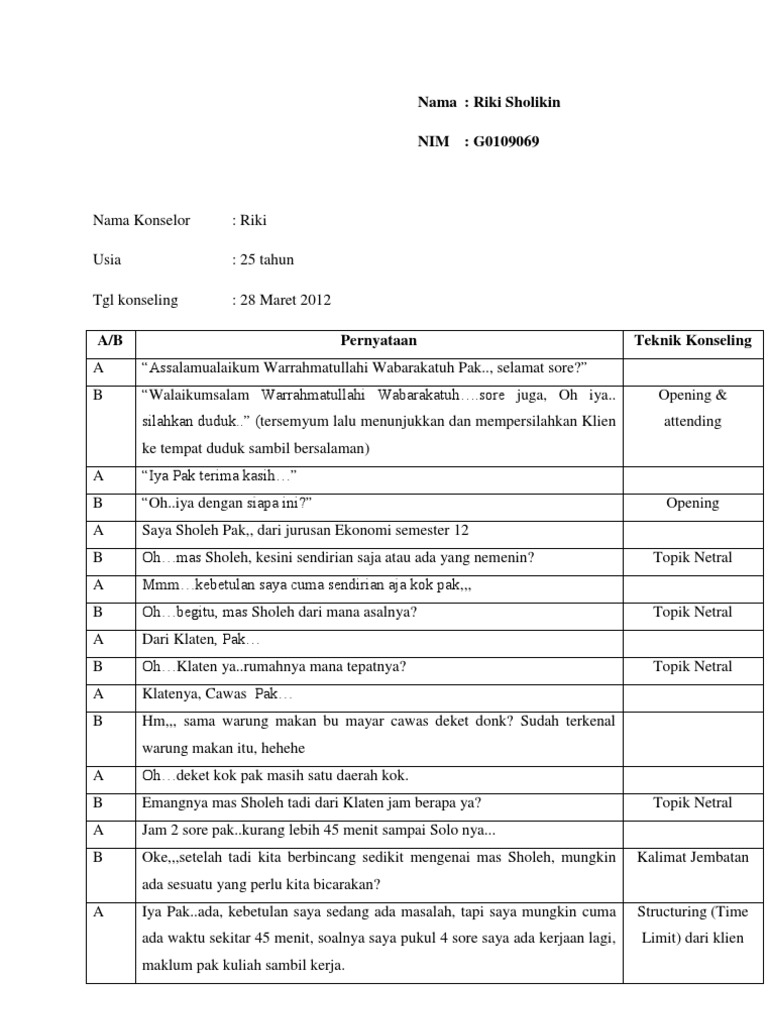Contoh verbatim konseling individu. Asas kerahasiaan menjamin semua data data atau informasi yang terkait dengan masalah kamu selanjutnya pertemuan kita ini dibatasi oleh waktu. Pelajar kelas 3 sma umur. 18 tahun agama. Hawinda ini bisa disebut siswa yang berprestasi di sekolah. Namun apa yang saya sebutkan ini merupakan hal yang sangat penting. Contoh dialog konseling individu gambaran singkat permasalahan konseli.